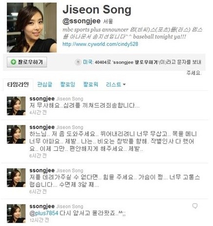 그리고 이건 송지선 전남친 사건이 일어너기전 아너운서 송지선이 트위터에 자살을 암시하는 글을 올린것에 대한 글인데 해킹이 아닌 직접 송지선씨가 작성을 한것으로 드러났데요 송지선씨가 작성한 글을 보면 저를 데려갈수 없다면 힘을 주세요 가슴이 고통스럽씁니다 수면제 3알째.. 하느님 저좀 도와주세요 뛰어내리려니 너무 무섭고 목을 메니 넘 아파요 비오는 창밖을 향해 작병인사도 다했어요 이제 편안해지게 해주세요 그래도 송지선씨가 무사한건 정말 다행이에요 정말 트위터의 힘이 대단한것 같습니다 트위터에서 이 글을 발견을 하고 신고가 되었다고 합니다