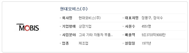 현대모비스라는 회사는 현대자동차의 제조업 회사로서 상당한 자금력을 가지고 있는 것을 알 수 있을것입니다.