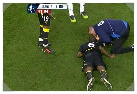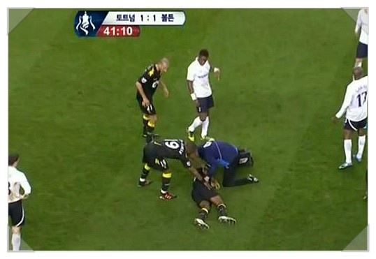 토트넘 볼튼의 경기에서 볼튼의 미드필드 무암바가 갑자기 경기장에서 쓰러지는 일이 발생했다.