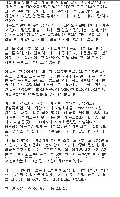 송지선 아너운서가 하던 프로그램을 하차하고 올린 글이라네용.. 진실이 어떻든 누가 잘잘못을 했든.. 하늘너라에 가서는 즐겁게 사랑도 하고 행복하게 지냈으면 좋겠어요~ 삼가 고인의 명복의 빕니당~
