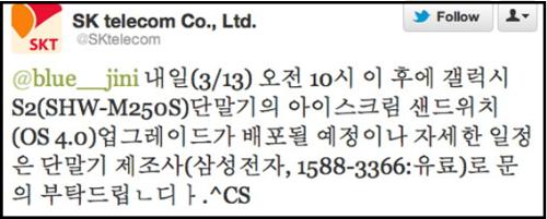 SK텔레콤(SKT)는 공식 트위터 계정을 통하여 삼성전자가 갤럭시S2 아이스크림 샌드위치(ICS)의