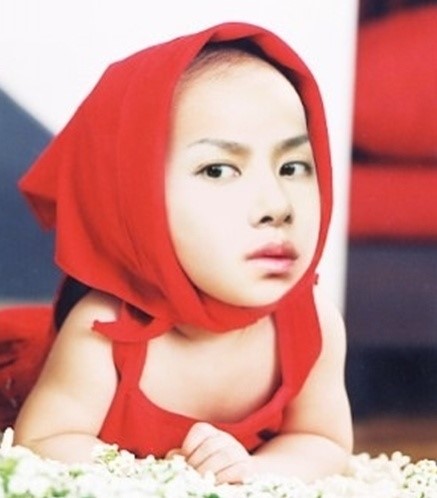 김희철이 공개한 아기 합성 사진은 빨간 민소매티에 두건을 두른 아기의 몸에